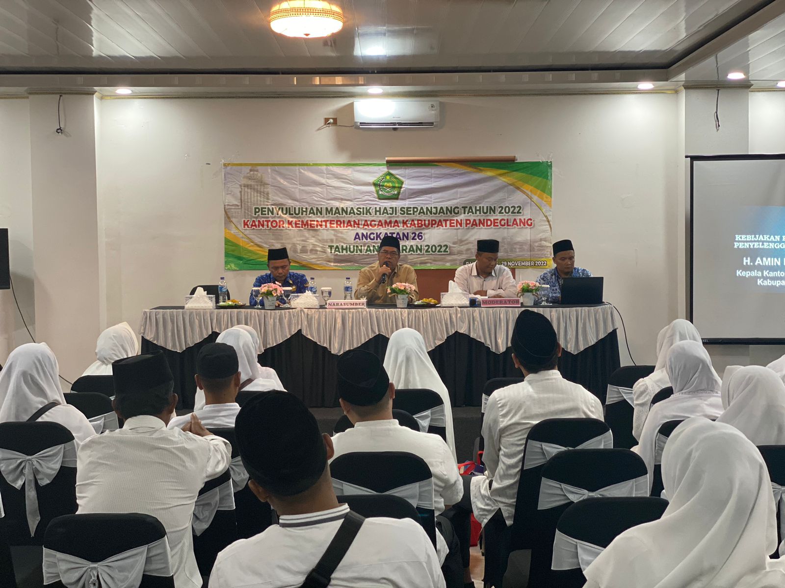 Humas Kemenag – Kepala Kantor Kementerian Agama Kabupaten Pandeglang menghadiri kegiatan Penyuluhan Manasik Haji SepanjangTahun 2022 Kantor Kementerian Agama Kabupaten Pandeglang angkatan 26 Tahun Anggaran 2022 di Aula Pariwisata Kolam Renang DM Tirta Persada Pandeglang Banten, didampingi oleh Kepala Seksi Penyelenggara Haji dan Umrah Terpadu H. Agus Salim, S.Ag. M.S.I., beserta staff Seksi PLHUT (29/11/22). Masih sama sperti yang sudah dilaksanakan beberapa hari yang lalu di tanggal 1-14 November 2022, penyuluhan ini masih mengenai informasi manasik haji, memberikan pemahaman dan tata cara pelaksanaan haji serta hikmah dari haji itu sendiri. Perihal ini sangatlah penting, para peserta di tiap-tiap angkatan dengan tujuan pada saat pelaksanaan nanti para calon jamaah haji bisa menjalankan ibadah haji dengan sempurna, dan memang nantinya disana akan ada pembimbing atau petugas haji yang sudah terlatih ditunjuk untuk mengarahkan para calaon jamaah haji. Selasa, 29 November 2022.