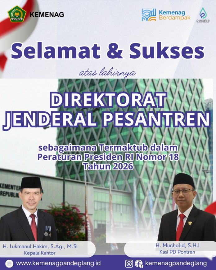 BerandaFlayer UcapanSelamat Atas Terbentuknya Direktorat Jendral Pesantren Flayer Ucapan Selamat Atas Terbentuknya Direktorat Jendral Pesantren 7 By Opung Kamis, 23 April 2026 Bagikan FacebookTwitterPinterestWhatsApp BERITA LAINNYA Flayer Ucapan Selamat Hari Bumi 2026, Our Power Our Planet Rabu, 22 April 2026 Flayer Ucapan Selamat Hari Kartini Tahun 2026 Selasa, 21 April 2026 Flayer Ucapan Selamat dan Sukses PPID Kanwil Kemenag Banten atas diraihnya penghargaan PPID Unit Kanwil Berkinerja Terbaik dengan nilai 94,5 Jumat, 12 Desember 2025 KEPALA KANTORKepala Kantor Kemenag Pandeglang2024 – SekarangImron - Minggu, 19 Januari 20250 FLAYER UCAPANFlayer UcapanSelamat Hari Bumi 2026, Our Power Our PlanetOpung - Rabu, 22 April 20260Flayer UcapanSelamat Hari Kartini Tahun 2026Opung - Selasa, 21 April 20260Flayer UcapanSelamat dan Sukses PPID Kanwil Kemenag Banten atas diraihnya penghargaan PPID Unit Kanwil Berkinerja Terbaik dengan nilai 94,5Opung - Jumat, 12 Desember 20250Flayer UcapanSelamat & Sukses atas dilantiknya Bapak H. SUPARDI, S.Pd.I.,M.Pd sebagai Kepala Kantor Kementerian Haji dan Umroh Kabupaten PandeglangOpung - Jumat, 5 Desember 20250Flayer UcapanSelamat & Sukses atas dilantiknya Bapak H. Deden Apriandhi H., S.STP., M.Si. sebagai SEKRETARIS DAERAH PROVINSI BANTEN.Imron - Jumat, 11 Juli 20250 BACA JUGA Transformasi Budaya Kerja ASN Selasa, 28 April 2026 Penyuluh Agama Islam Gelar BRUS di SMP Negeri 1 Kaduhejo, Tanamkan Nilai Remaja Qurani Senin, 27 April 2026 Kemenag Pandeglang Percepat Sertifikasi Lahan Masjid dan Musala melalui Kolaborasi DMI dan BPN Senin, 27 April 2026 Pembinaan Pengawas, MGMP, KKG dan FKG PAI, Bahas TPG dan Kesejahteraan Guru PAI Kamis, 23 April 2026 Muat lebih banyak