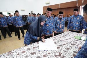 Para pejabat yang dilantik mengikuti pengambilan sumpah jabatan sebagai bentuk komitmen untuk meningkatkan kinerja, menjaga integritas, serta memberikan pelayanan terbaik kepada masyarakat.