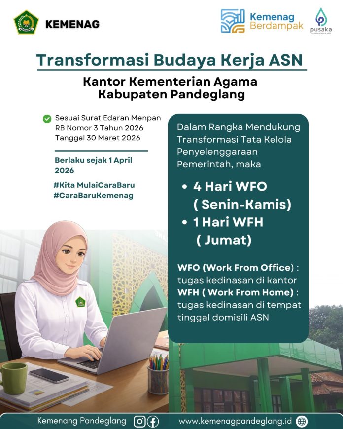 BerandaInfo PentingTransformasi Budaya Kerja ASN Info Penting Transformasi Budaya Kerja ASN 7 By Opung Selasa, 28 April 2026 Bagikan FacebookTwitterPinterestWhatsApp BERITA LAINNYA Info Penting Transformasi Kerja ASN, Pelayanan Tetap Optimal Jumat, 10 April 2026 Berita Pemerintah Tetapkan 1 Ramadan 1447 H Jatuh pada 19 Februari 2026 Selasa, 17 Februari 2026 Info Penting Minggu, 31 Agustus 2025 KEPALA KANTORKepala Kantor Kemenag Pandeglang2024 – SekarangImron - Minggu, 19 Januari 20250 FLAYER UCAPANFlayer UcapanSelamat Atas Terbentuknya Direktorat Jendral PesantrenOpung - Kamis, 23 April 20260Flayer UcapanSelamat Hari Bumi 2026, Our Power Our PlanetOpung - Rabu, 22 April 20260Flayer UcapanSelamat Hari Kartini Tahun 2026Opung - Selasa, 21 April 20260Flayer UcapanSelamat dan Sukses PPID Kanwil Kemenag Banten atas diraihnya penghargaan PPID Unit Kanwil Berkinerja Terbaik dengan nilai 94,5Opung - Jumat, 12 Desember 20250Flayer UcapanSelamat & Sukses atas dilantiknya Bapak H. SUPARDI, S.Pd.I.,M.Pd sebagai Kepala Kantor Kementerian Haji dan Umroh Kabupaten PandeglangOpung - Jumat, 5 Desember 20250 BACA JUGA Penyuluh Agama Islam Gelar BRUS di SMP Negeri 1 Kaduhejo, Tanamkan Nilai Remaja Qurani Senin, 27 April 2026 Kemenag Pandeglang Percepat Sertifikasi Lahan Masjid dan Musala melalui Kolaborasi DMI dan BPN Senin, 27 April 2026 Selamat Atas Terbentuknya Direktorat Jendral Pesantren Kamis, 23 April 2026 Pembinaan Pengawas, MGMP, KKG dan FKG PAI, Bahas TPG dan Kesejahteraan Guru PAI Kamis, 23 April 2026 Muat lebih banyak